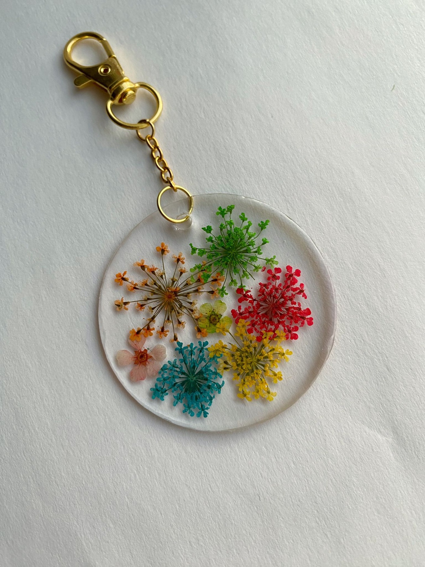 Brelocul este realizat manual din rășină transparentă și flori naturale uscate, atent alese și sigilate pentru durabilitate. Fiecare piesă este unică, datorită compoziției florale.