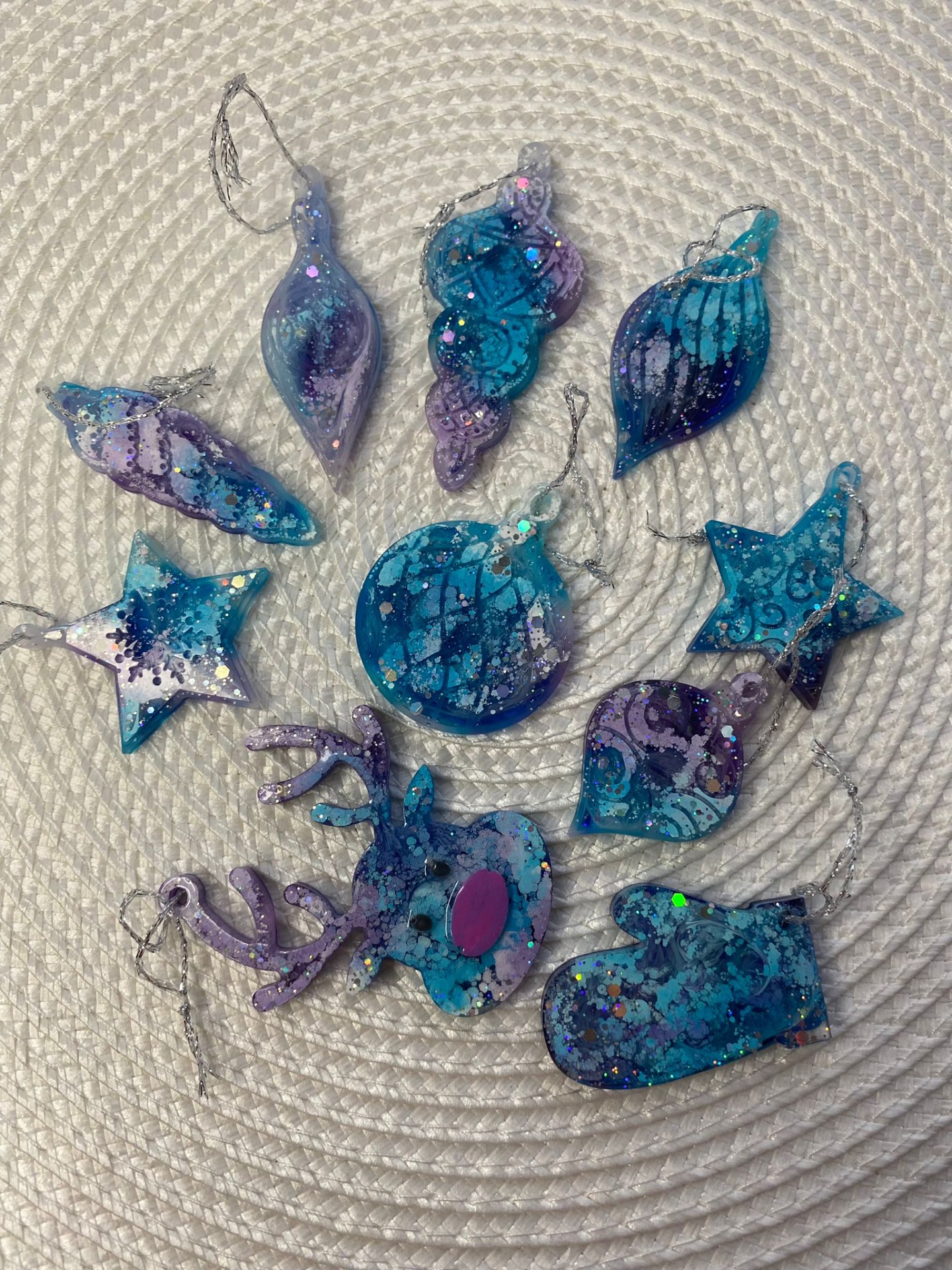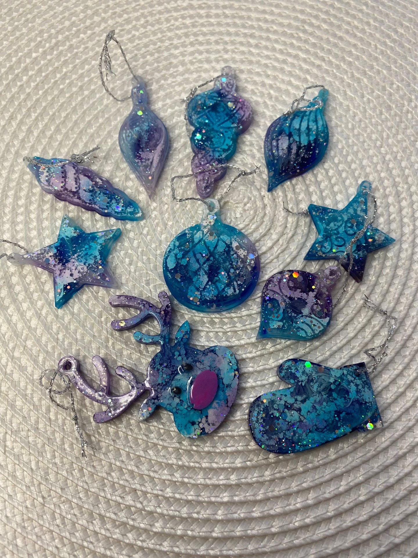 Decorațiuni de Crăciun realizate manual din rășină epoxidică, în culori unice și forme care aduc lumină, echilibru și simplitate.
