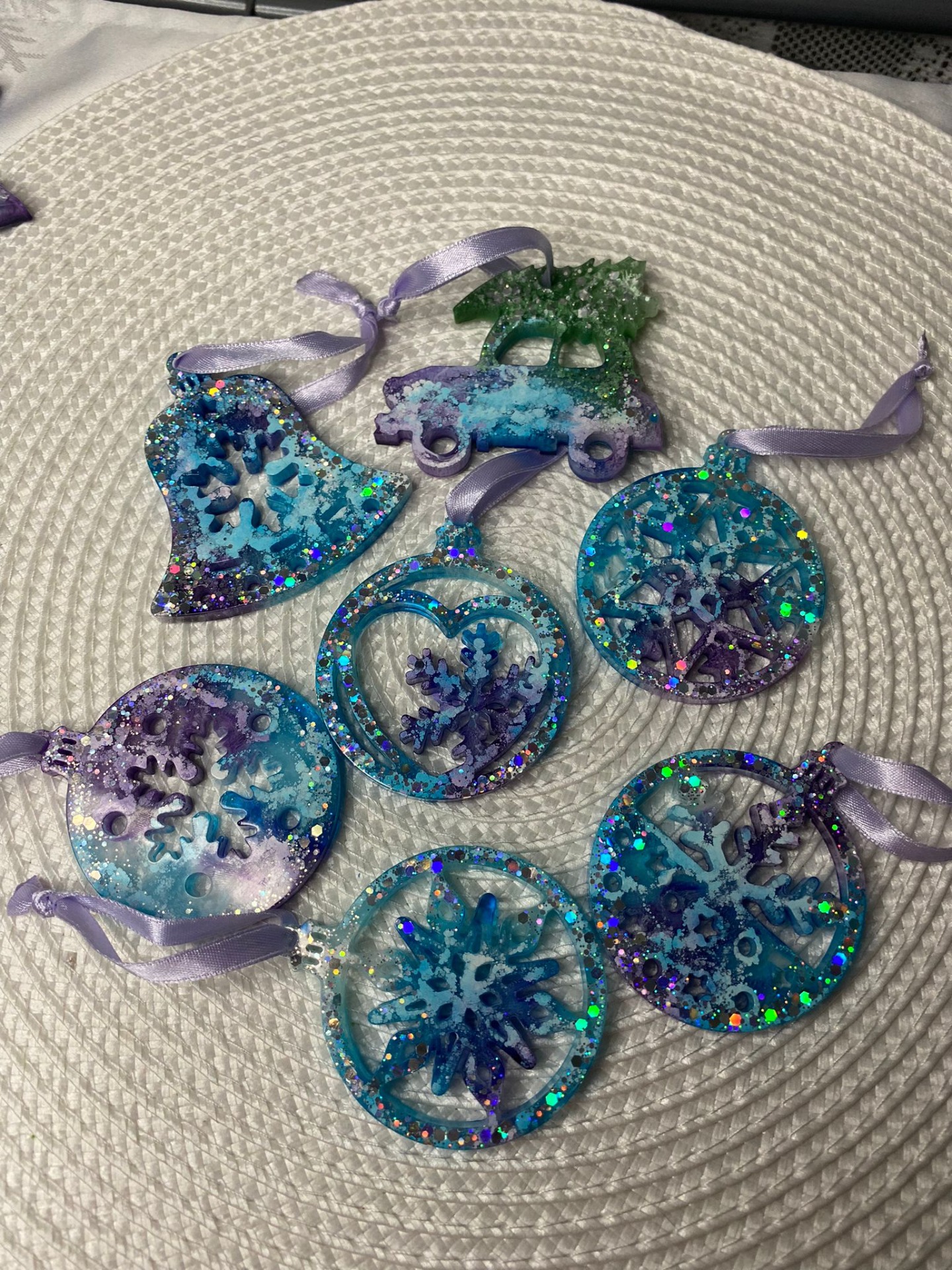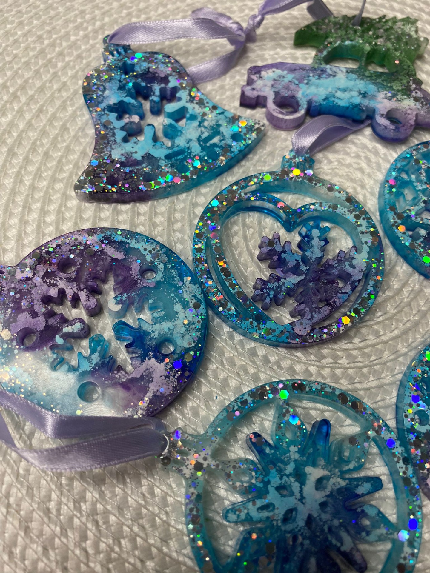 Decorațiuni de Crăciun realizate manual din rășină epoxidică, în culori unice și forme care aduc lumină, echilibru și simplitate.